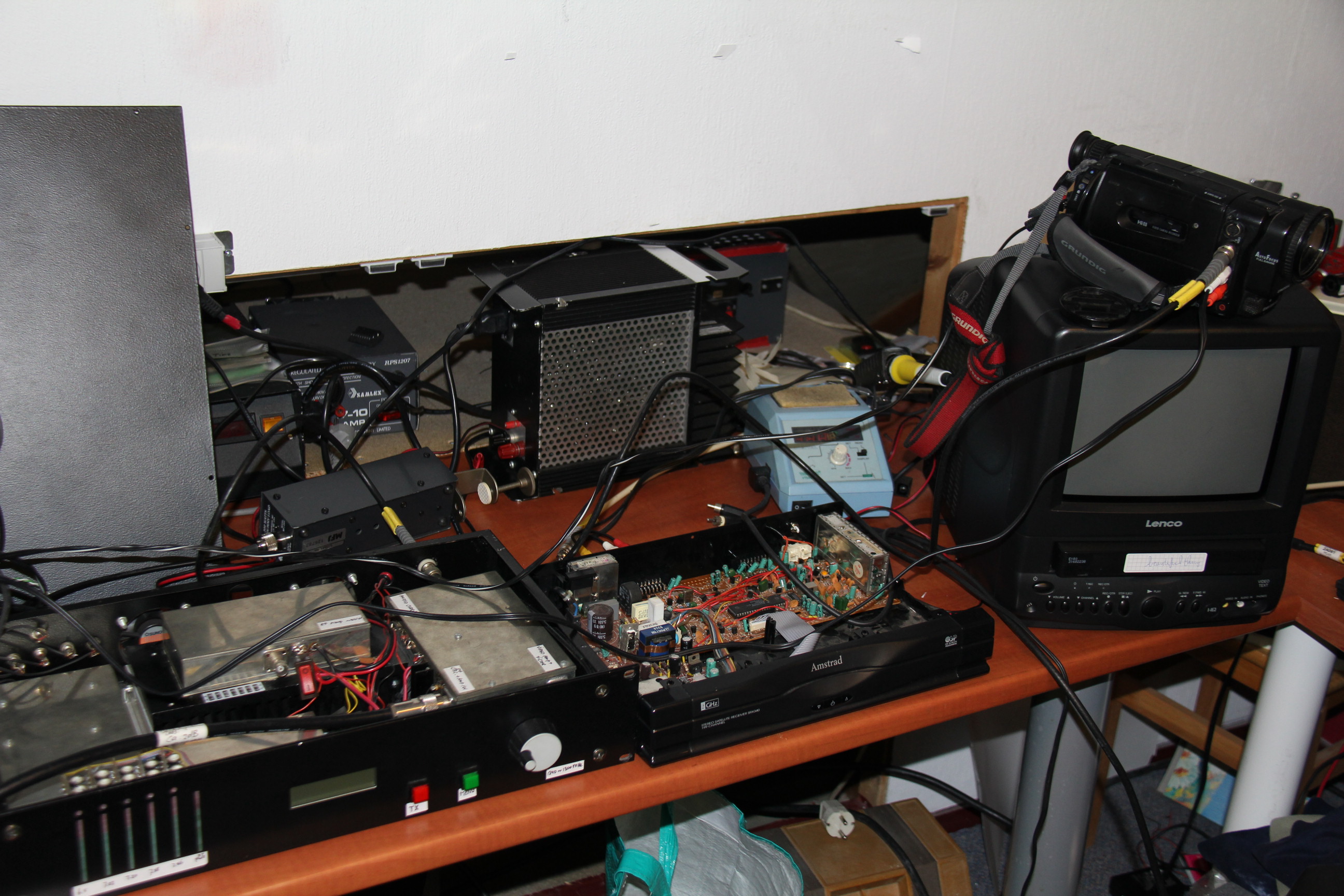 Eerst het bureau maar eens vol zetten. De zender was er neergezet om wat andere experimenten te doen. Zoals bijvoorbeeld of de Amstrad dat signaal kon oppakken. Ik wil het liefst PI6ATV kunnen ontvangen. Dus omgebouwde LNB (3cm naar 23cm converter) gepakt, aangesloten op de Amstad, schotel gepakt en proberen maar! Nou, niets! Niet eens een beetje extra ruis ofzo... helemaal niets. PI6ATV zit daar toch wel even 10W op 3cm te maken op 220m hoogte! Dat moet toch werken? Ondanks dat bultje... je zou denken dat hij daar wel overheen moet kijken. Staat de ontvanger wel goed op frequentie? Is de LNB niet verlopen?