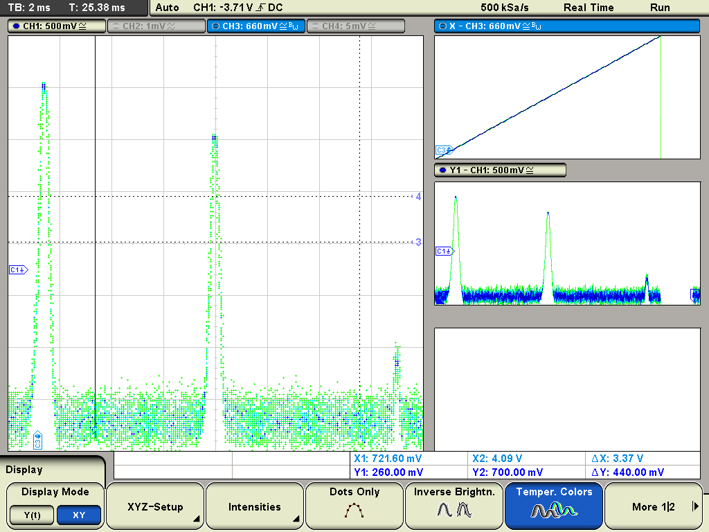 Sweep time (P2) stel je zodanig in, dat het beeld op de scope niet meer hinderlijk knippert. Te snel zorgt ervoor, dat de IF het niet meer bijhoudt, dus kies gewoon een comfortabele waarde (tegen de klok in is sneller).