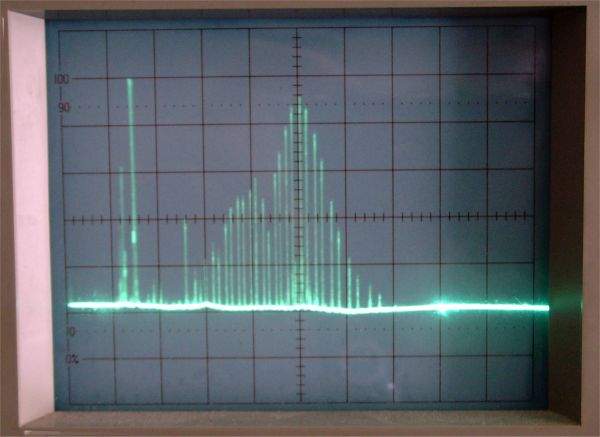 Hor shift P1 stel je steeds wat bij nadat je de 0 MHz paal in beeld ziet. Kijk op de counter tot daar ca. 000,0 MHz staat en regel de hor-shift zodanig af, dat de paal in het midden van de scoop staat. Het is een kwestie van balanceren, want andere potmeters beïnvloeden ook deze stand. Eigenlijk moet eerst de tuner en IF grof worden afgeregeldom überhaupt een paal te zien op 0 MHz (begin dan ook met die paal op 0 MHz), in plaats van een bult. In de tuner kunnen de twee inbus ferriet kernen worden afgeregeld en de AFC draai je ongeveer een halve centimeter in tot hij een mooie hogere vorm heeft. Deze kernen breken snel, dus voorzichtig met een goed passende (liefst kunststof) inbus afregelen zodat deze kring wat omlaag getrokken wordt (staat op 38MHz en moet nu 30MHz worden).