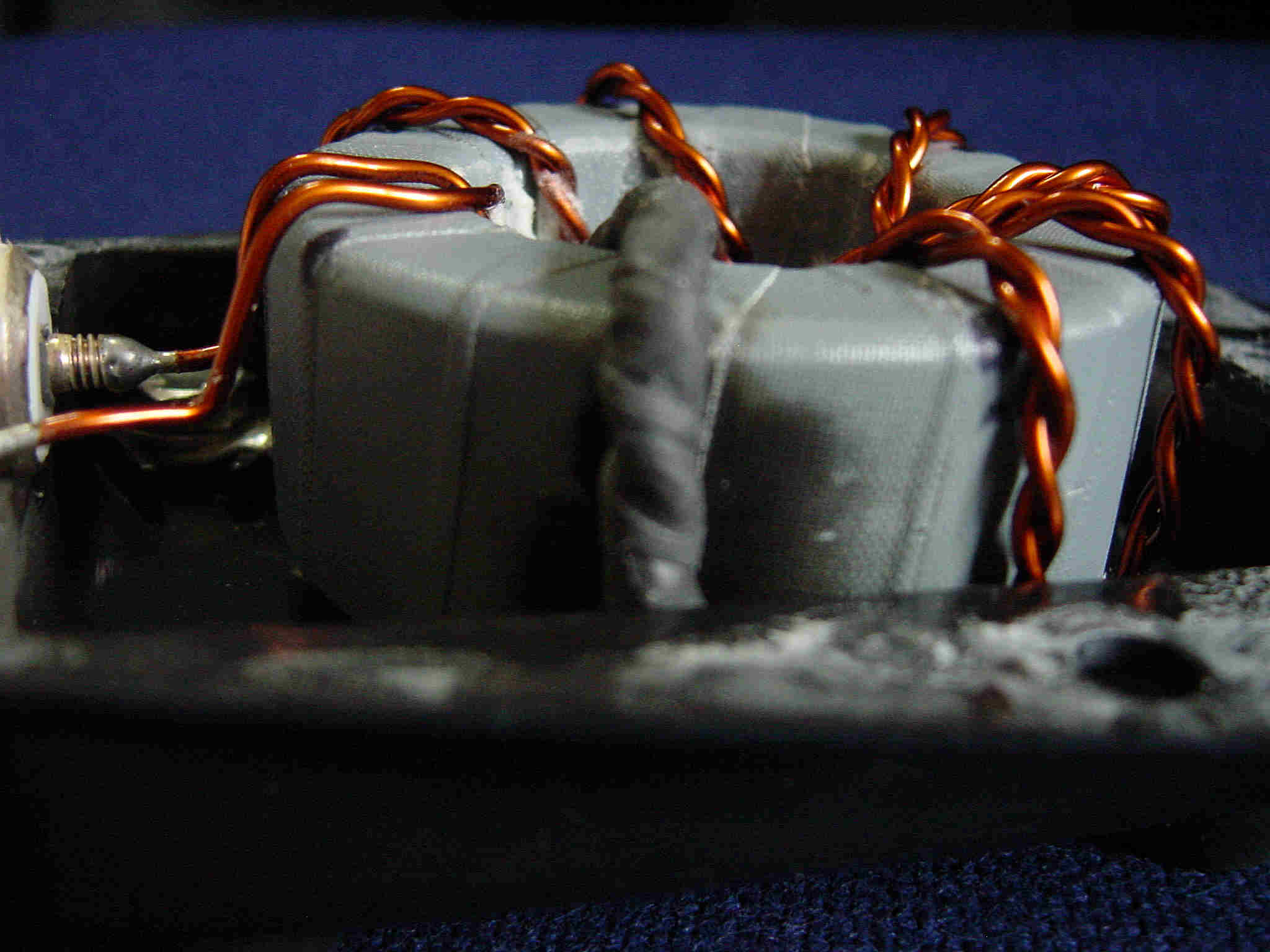 Na het droogprocess heb ik alle twee de wikkeldraden met PTFE tape omwikkeld om een nog betere isolatie tegen doorslag te verkrijgen. Daarna de draden weer netjes in elkaar getwist en met zelfvulkaniserende tape afgeisoleerd en weer om de ring kern gewikkeld. Bij nameten blijkt dat de isolatie weer optimaal is en de boel weer in de behuizing gemonteerd.
