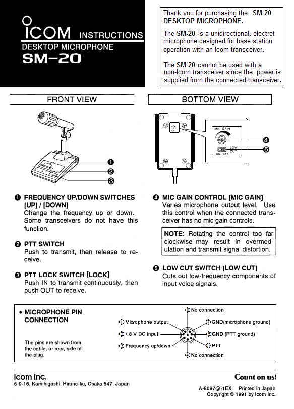 Hier de gegevens van de ICOM SM-20 microfoon.