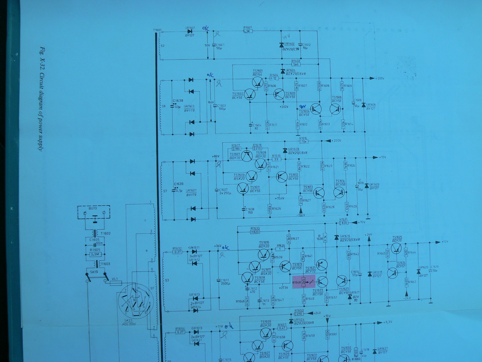 Maar in het manual staat dat na -150V de tweede spanning -24V is en deze is nagenoeg nul. Er staat wel 38V op de collector van tor 1639 maar 0V op de basis en 0V op de uitgang.