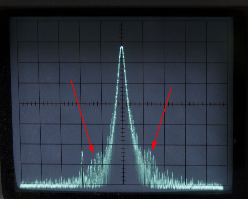 - Voordat het extra filter was geplaatst. Let op de spikes links en rechts op de helling van de draaggolf.