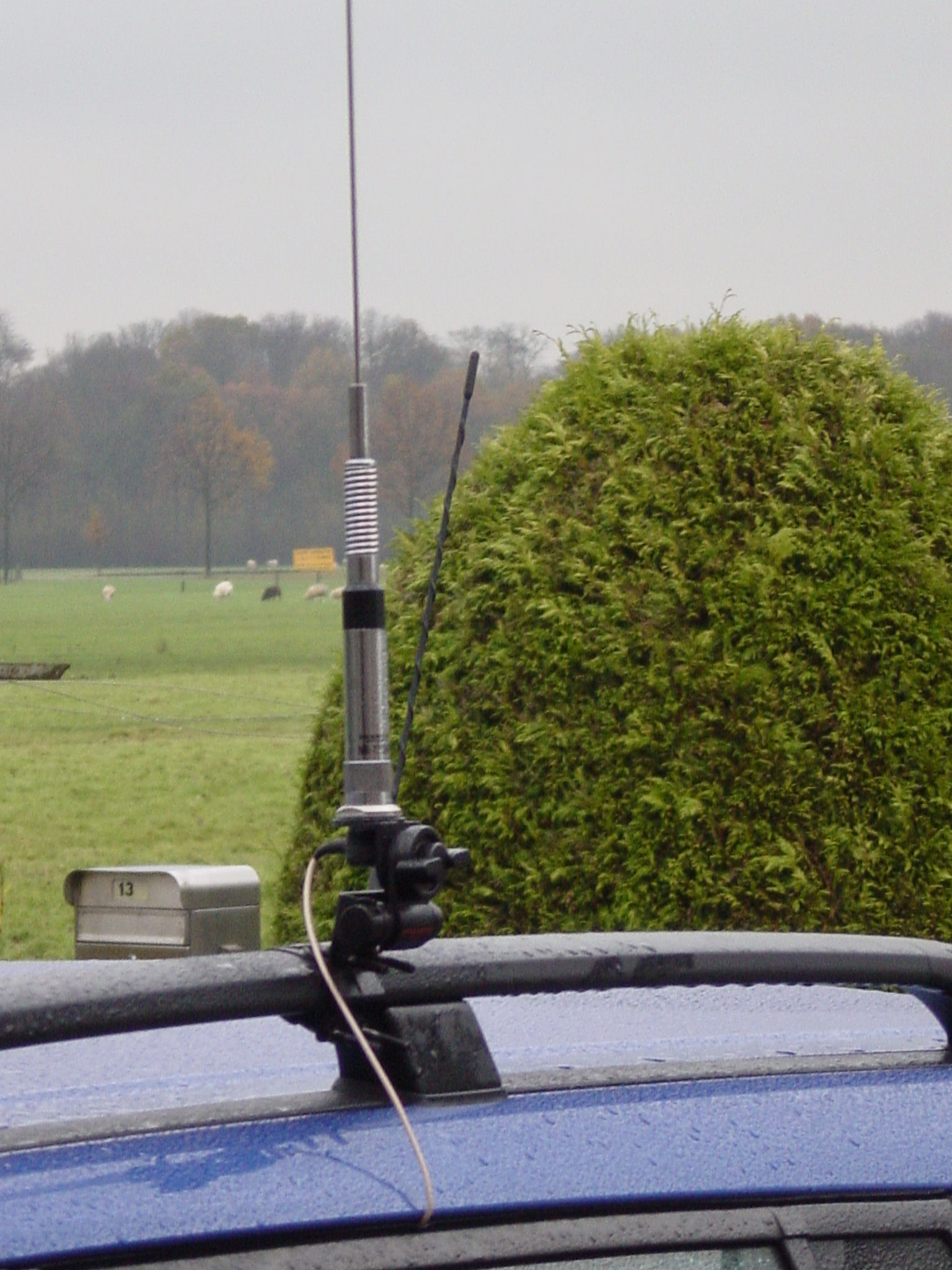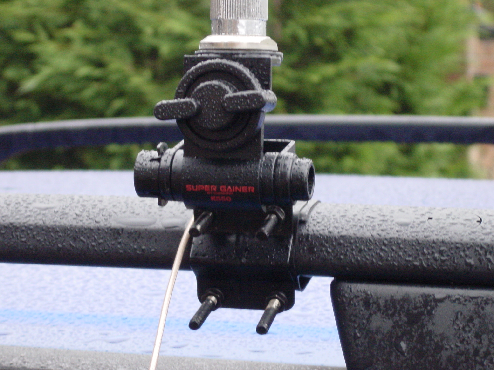 Deze constructie staat volledig elektrisch geisoleerd op de dakrails en indien je hier een HF antenne op wilt zetten moet je dus wel een goede RF-ground aan het geheel maken. Je zou dat kunnen doen door een voldoende dik stuk litze aan het draadeinde te bevestigen en dat tussen het deurrubber aan een van de bouten van het portierscharnier te verbinden. En als tweede waarschuwing geld dat de antenne die nu hierop gebruikt word een zogenaamde "Radialless" antenne is die geen tegencapaciteit benodigd.