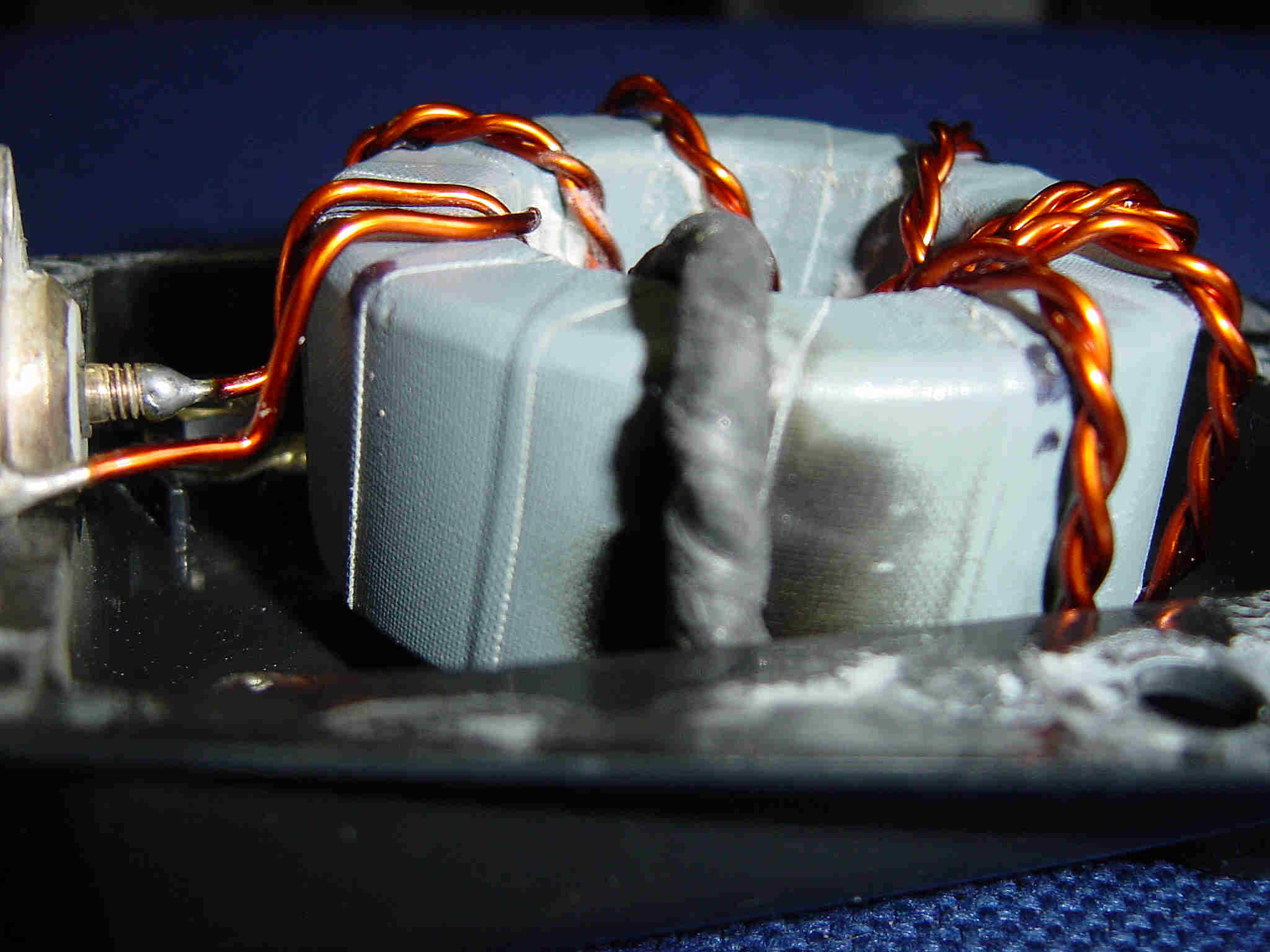 Ik heb de ringkernen met daarop de wikkelingen uit de behuizing gehaald en daarna het polyurethaan schuim zoveel mogelijk verwijderd. Daarna de verbrande wikkeling afgewikkeld zodat ik de koolstof goed kon verwijderen.