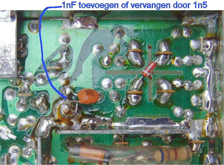 ON1BES, je eerste foto, 1 nF vervangen door 1N5. Gezien je tuner probleem, Kijk even of het pootje niet rakeling langs of zelfs tegen het massa vlak van de doorvoer C loopt.