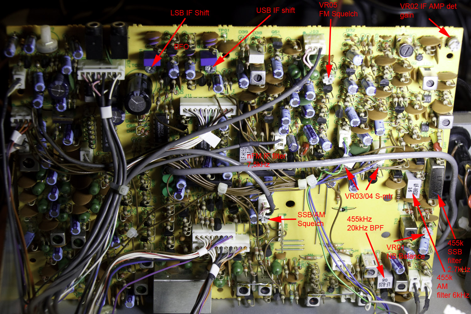 Afgelopen dagen bezig geweest met het plaatsen van een 2,3kHz kristalfilter. Het origineel is 2,7kHz en vaak merkbaar iets te breed. Gelijk de potmeters en dergelijke uitgezocht. Dat staat ook allemaal in de service manual (zie eerste post), maar misschien vind je dit wel handig. Hier dus een plaatje. Opmerking: VR01 = VR1001 in de service manual. Dit is sectie 10xx.