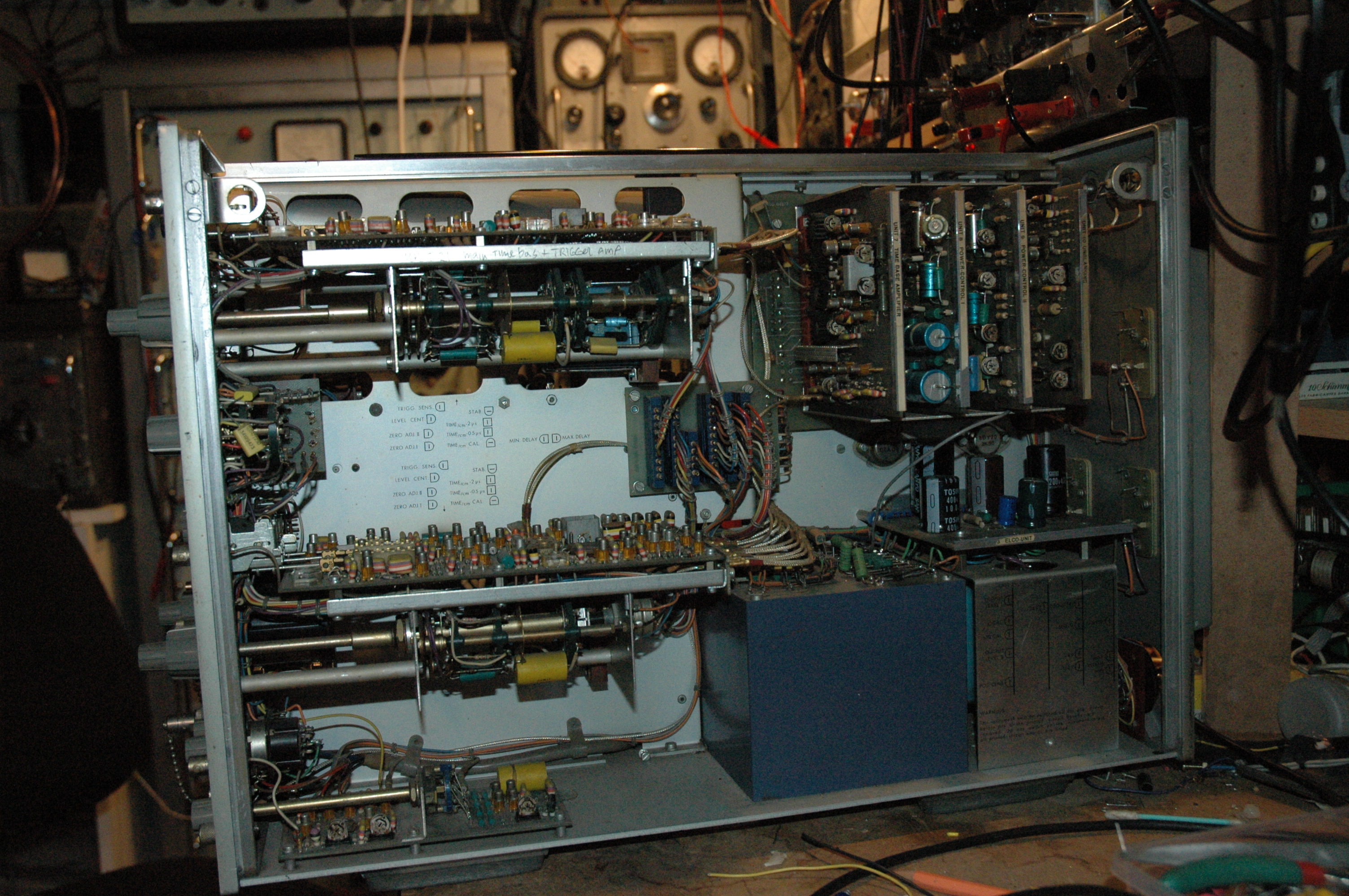 Gisteren de nieuwe voeding aangesloten., Klapte er 3x achter elkaar de diodes uit van de -24V. Tot ik er achter kwam dat dat gebeurden zodra ik het koelblok in de kast legde en dat dus aarde maakt. Wel vreemd want de regelaars zijn geïsoleerd gemonteerd. Maar eerst eens zien of ik beeld krijg. De +24 is een vaste regelaar en die geeft dus meer dan 25V, misschien een dikkere elco. -24V zakt in tot -23 dus die -6,3V op de zelfde wikkeling is blijkbaar niet zo'n goed idee of er moet een tor overheen omdat de regelaar begrenst. Kortom ik ben er nog lang niet. Wat een gedoe. Volgens mij is het haast makkelijker om mijn 6MHz buizen scoop op 100MHz te laten draaien dan deze te repareren. By the way, het is als grap bedoeld maar waarom kan deze scoop tot 150MHz, mijn philips maar tot 10MHz en die buizen tot 6. Wat is het frequentie bepalende onderdeel ? De beeldbuis, ? want dan weet ik nog een leuk project: die buizenscoop uitrusten met de beeldbuis van de 3370. :twisted: