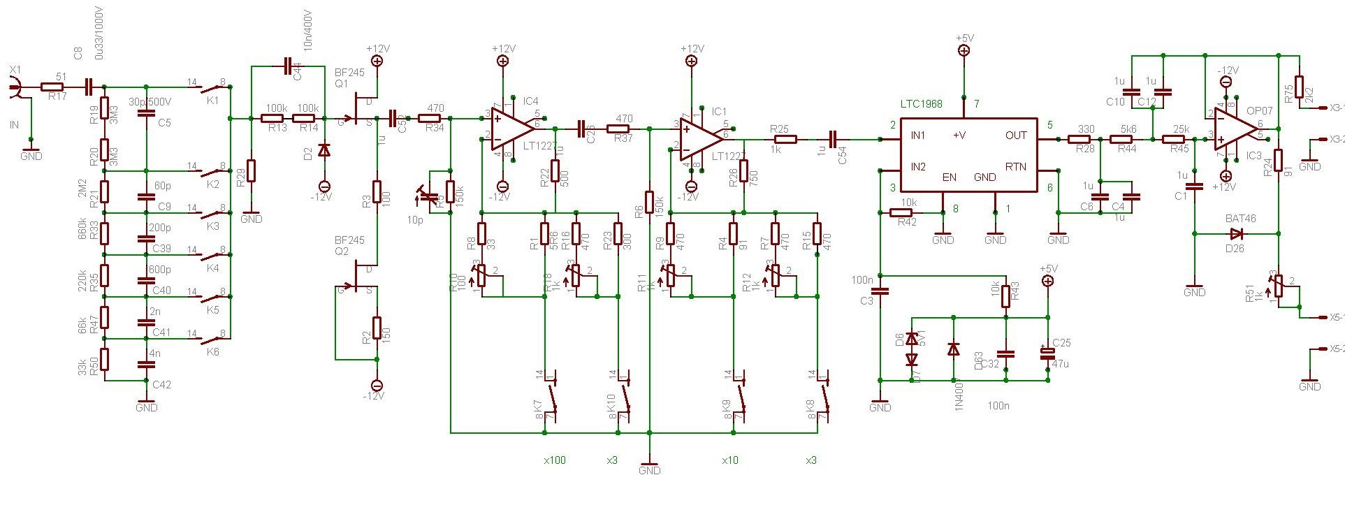 Dit is een TRMS ( True RMS) omvormer met een bandbreedte van ongeveer 5Hz-15MHz. Het ontwerp bestaat uit een verzwakker, Fet buffer, versterker bestaande uit twee zeer snelle current feedback opamps type LT1227 en een TRMS omvormer LTC1968. Dit is een aangepast ontwerp van Linear Technology. De buffer en de opamps kunnen met wat aanpassingen gebruikt worden tot ongeveer 100MHz. De LT1227 haalt bij een gain van 2 nog 140MHz en heeft een GBW van 1GHz. De LT1227 is zeer snel en ook erg gevoelig voor parasitaire capaciteiten en speciaal bij de feedback weerstand.