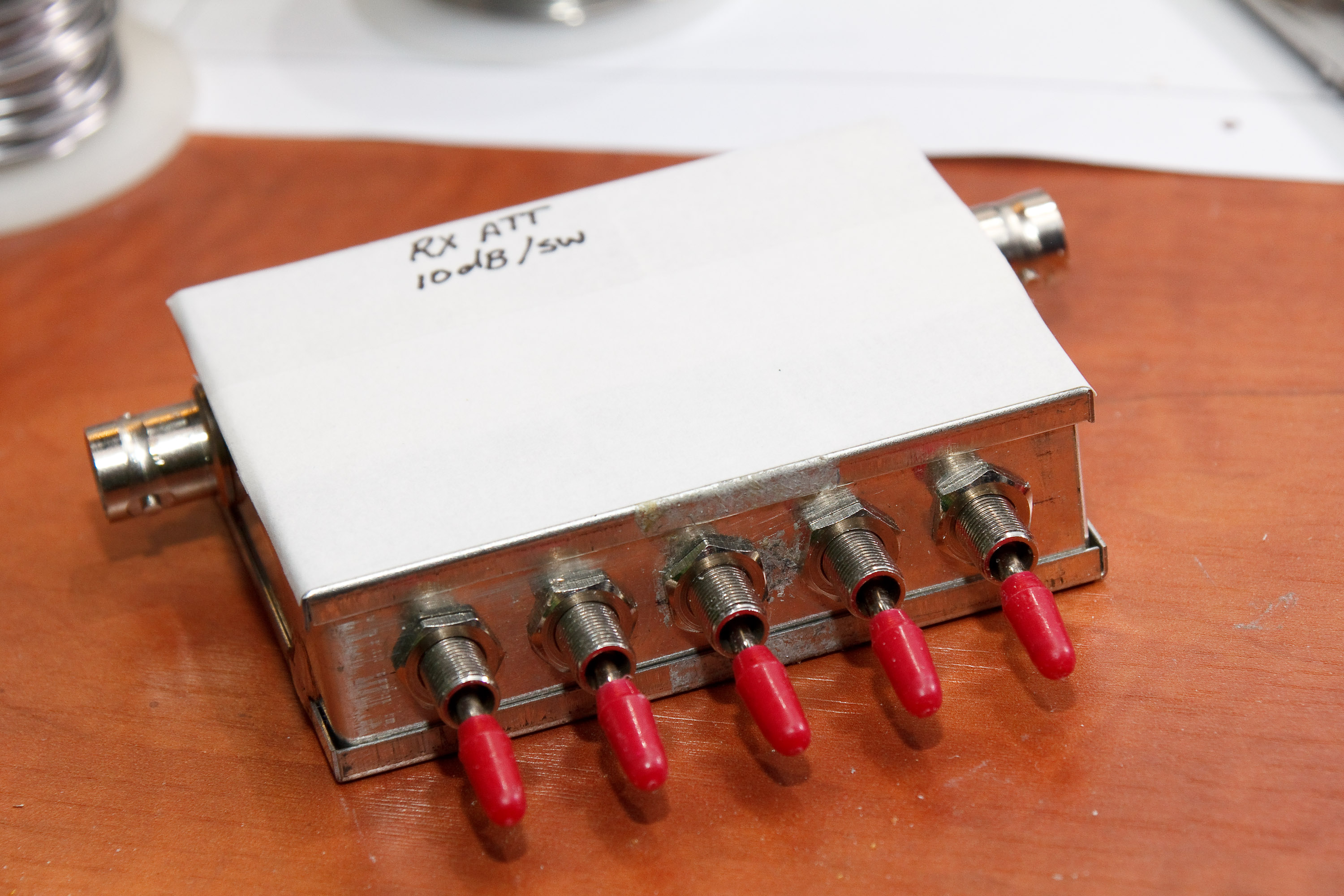 Mijn resultaat: Op lage (<150MHz) en hoge frequenties (150-500MHz) doen de eerste vier schakelaars keurig 10dB/schakelaar. De laatste schakelaar doet op lage frequenties net geen 10dB en op hoge frequenties ca. 5dB. De volgorde waarop de schakelaars gebruikt worden, maakt niet uit. De complete schakeling heeft in off-stand ook nog iets demping: Op lage frequenties bijna niets en op hoge frequenties loopt dat op tot ca. 3dB.