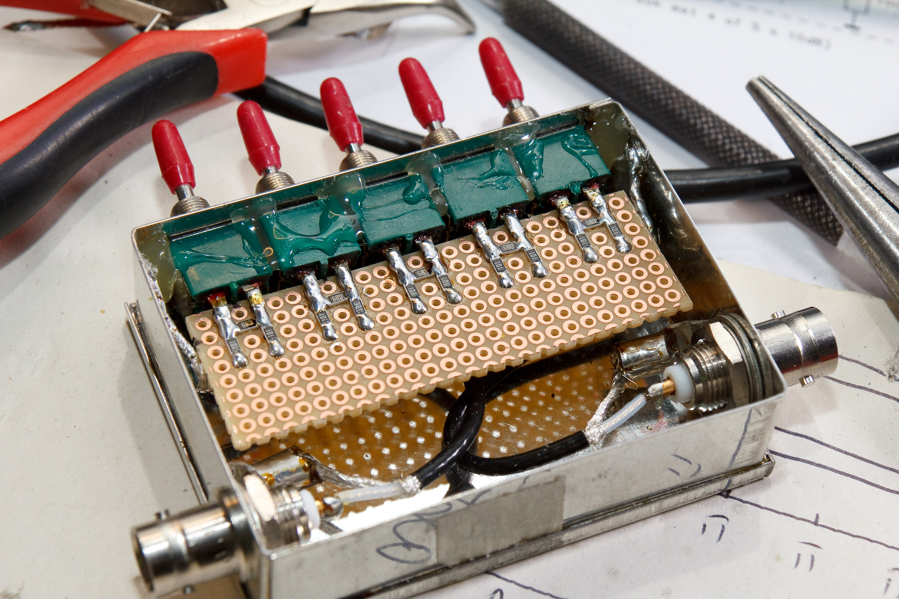 Bovenstaand voorbeeld was niet voldoende (ging goed tot 20dB en niet meer). Het moet veel demping opvangen, dus werk met een plaat (stuk koper printplaat ofzo). Dit draadje werkt bovendien als een soort spoel. Ook missen de schotjes tussen de weerstandsnetwerkjes nog. Maar gelukkig had ik ruimte overgelaten: