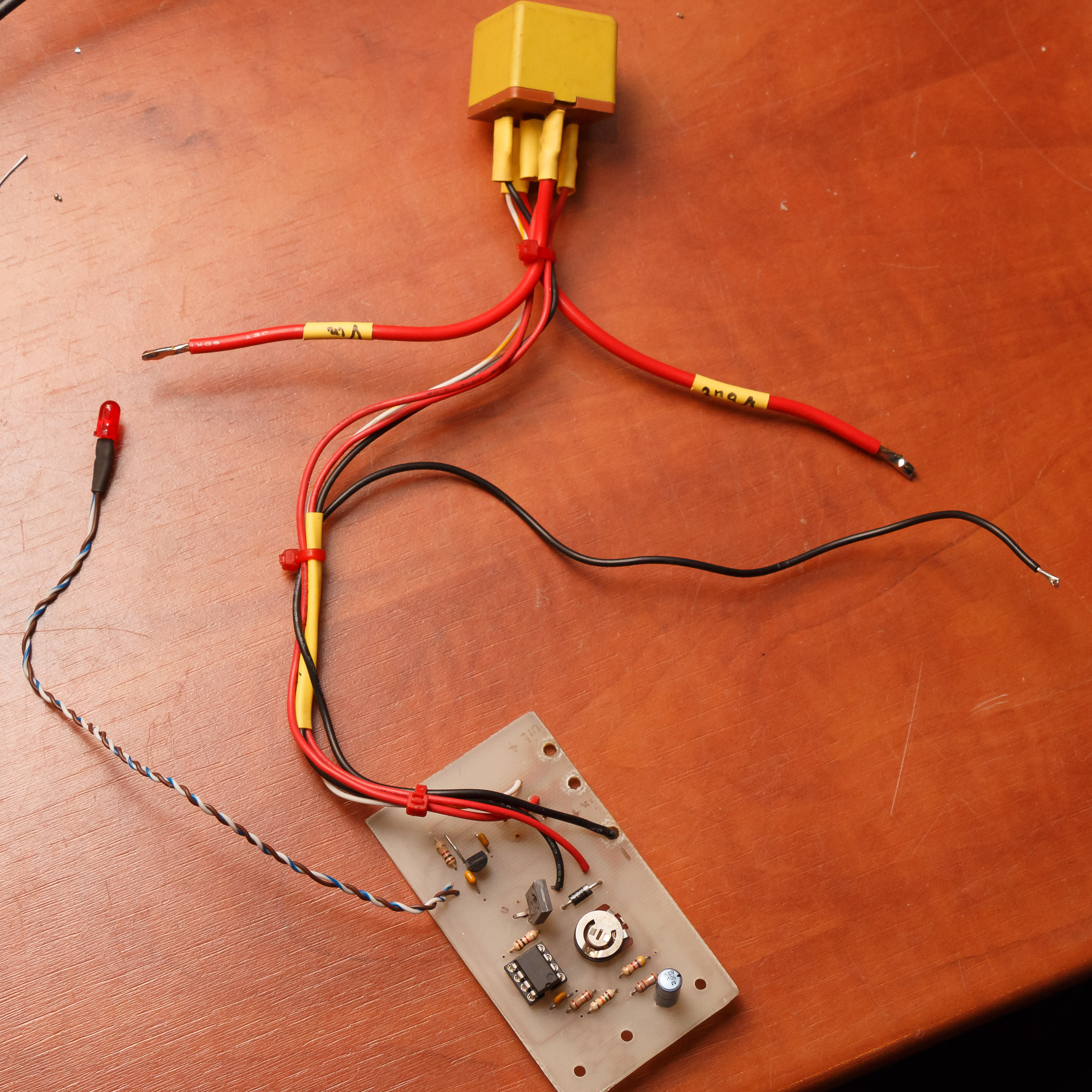 Ik heb dus een autorelais van 40A gebruikt (let op, je hebt ook 20A varianten). De stroom gaat niet meer door het printje, maar direct door het relais en er gaat een aftakking van de ingang naar de print (voor de opamp en de schakeltor).