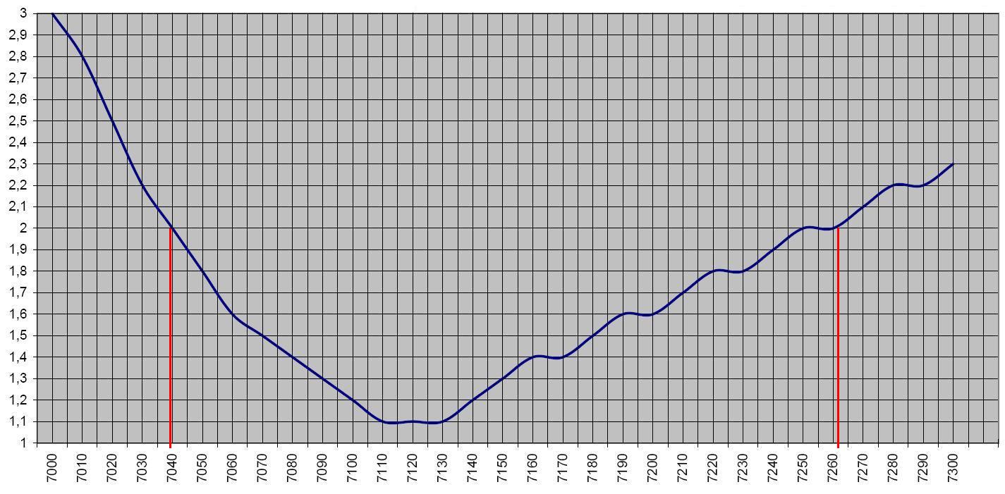 Hieronder tref je de SWR grafiek aan voor 40 meter. Het 80 meter gedeelte van de antenne afregelen was peanuts vergeleken bij het 40 meter gedeelte.