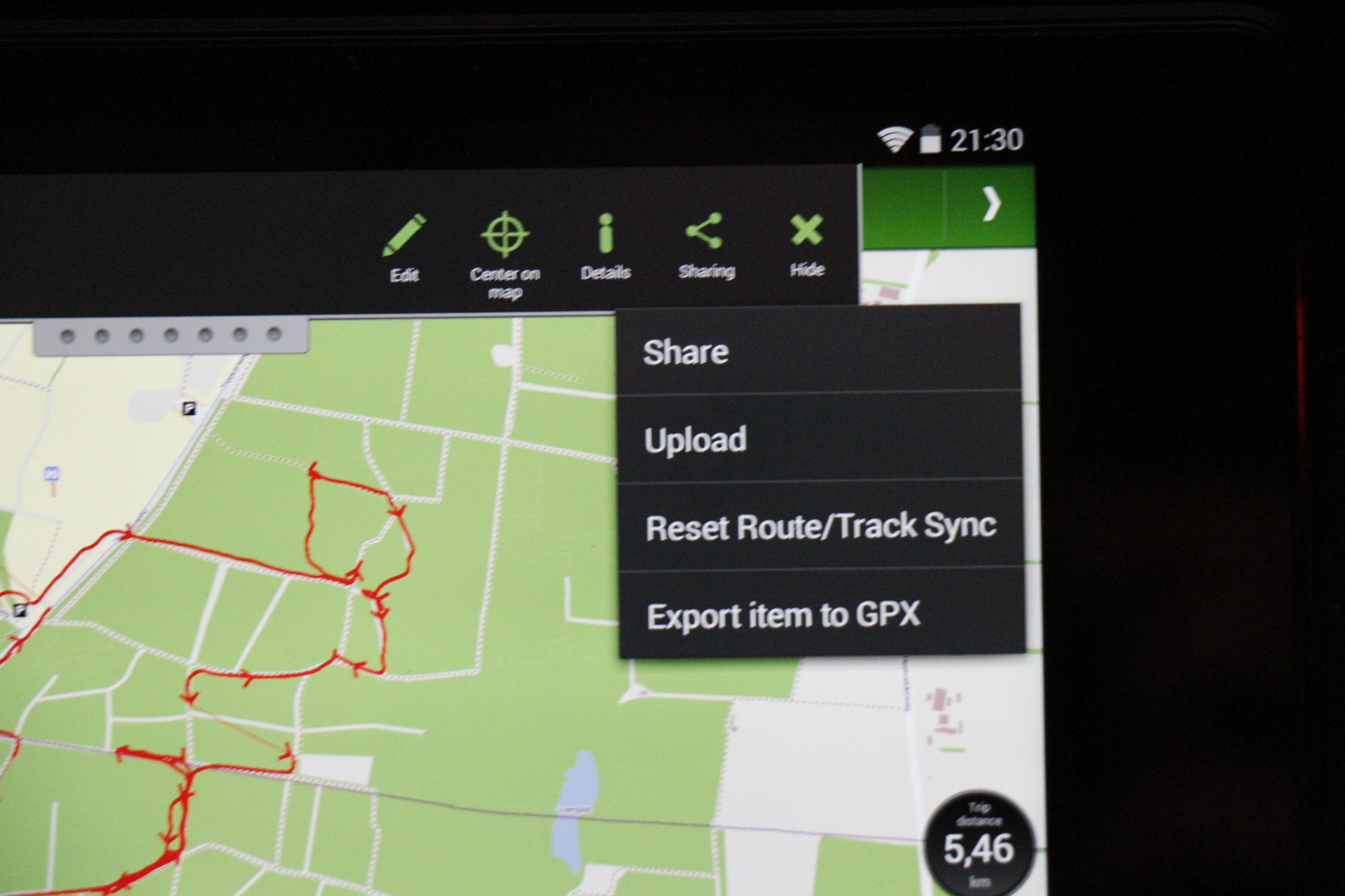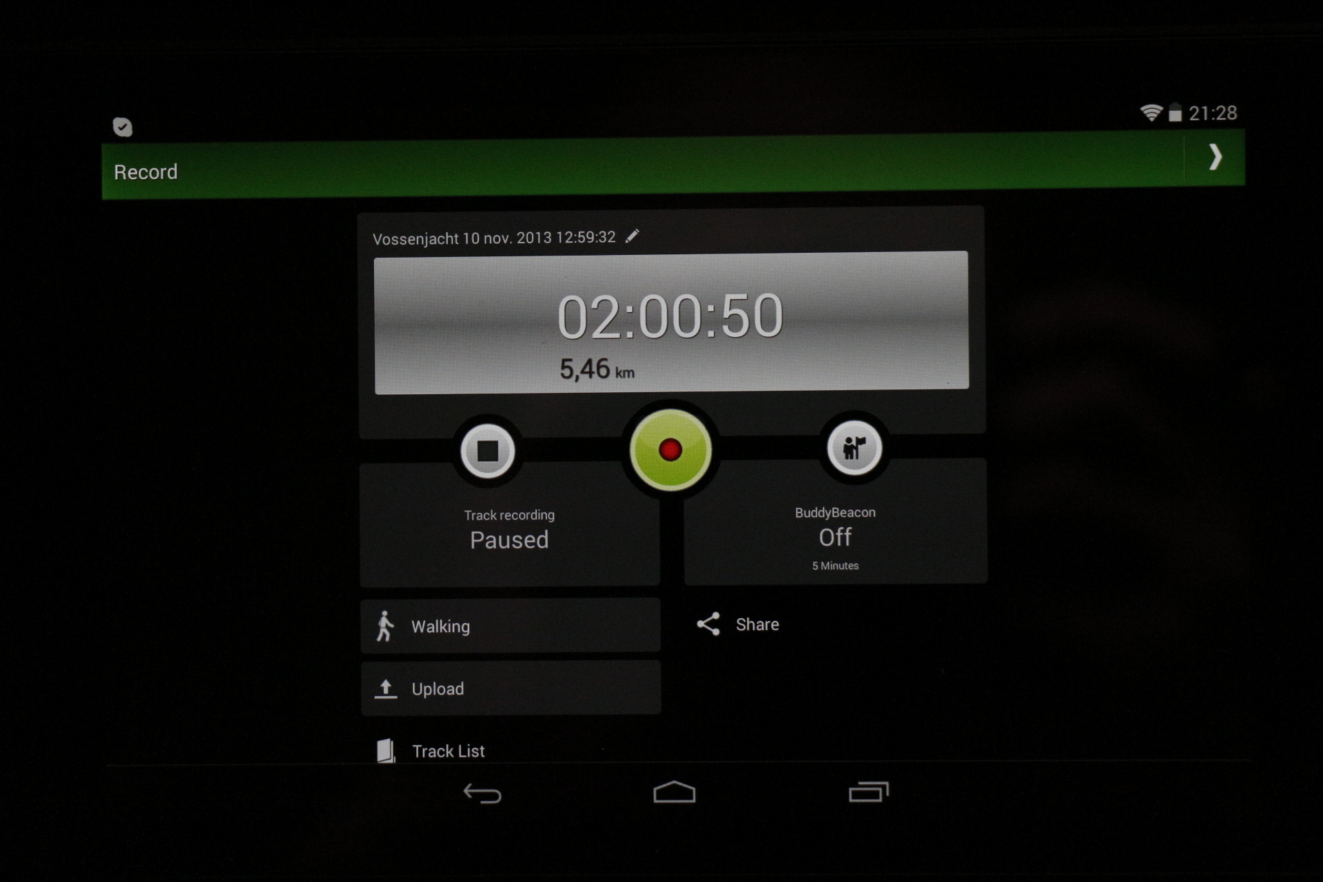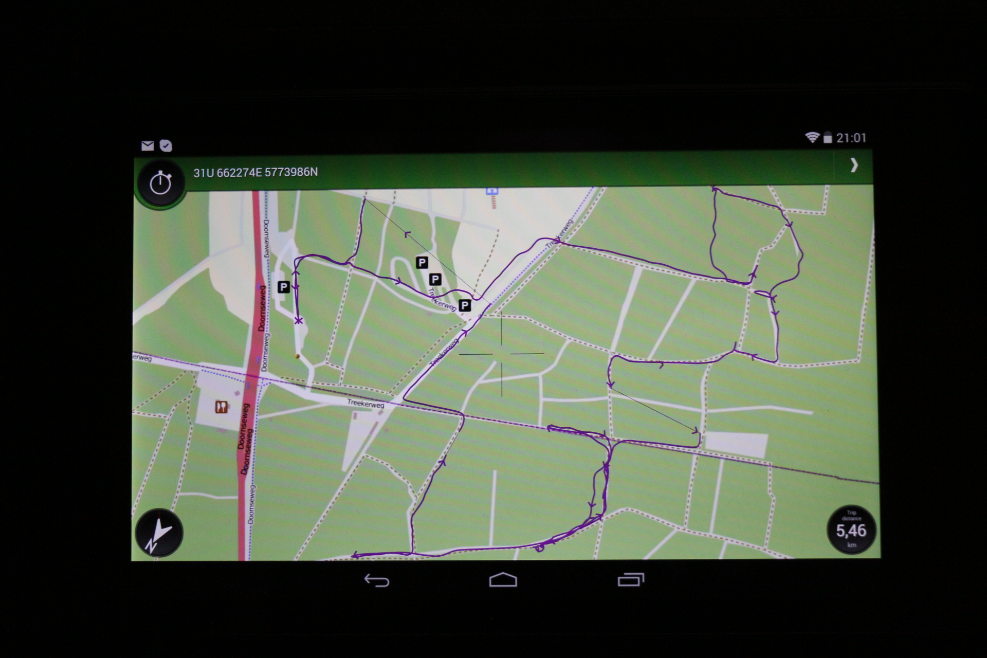 Screenshot van een 7 inch tablet met Viewranger. Geplot is een gelopen vossenjacht in Leusden.