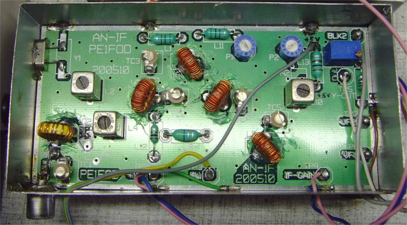 Laat mij even weten of bij jou ook sommige trimmers op het minimum of maximum staan bij maximaal signaal op de uitgang. Dat kun je herkennen als de maanvormige schijven volledig over elkaar heen gedraaid staan, of juist niet. Het kan exemplarisch voorkomen, dat je wat met parallel C-tjes moet spelen om de trimmer (TC) ergens in het midden te laten pieken. Bij mij heb ik C52 (werkt samen met TC3) moeten verlagen naar 15pF en C27+C54 (wertk samen met TC5) heb ik met nog eens 10pF verhoogd. Deze trimmers zitten in het 25kHz bandbreedte circuit. Het afregelen daarvan zie je dan ook uitsluitend als de bandbreedte schakelaar (BW) de 5-12V doorlaat.