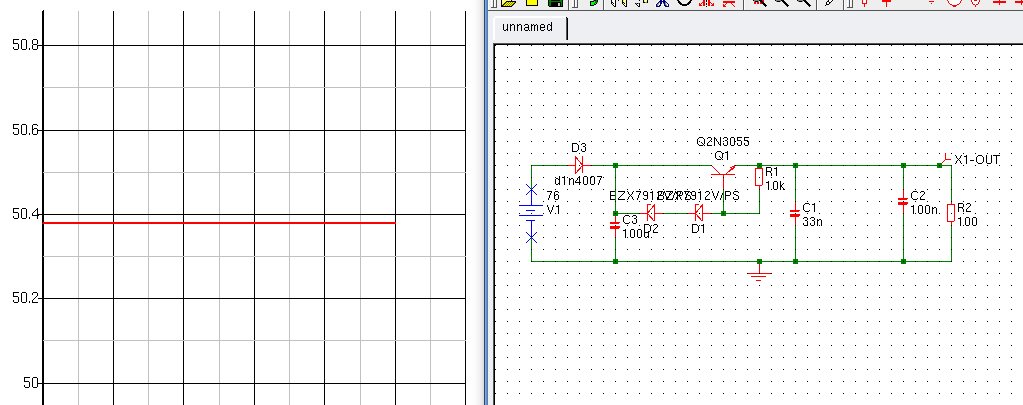 Hoe bepaal ik daar de uitgangspanning. Hij levert 24V tov de referentie dus moet de referentie 26V zijn om 50V uit te krijgen. Dat kan ik dan met een zener of een LM317 doen. Maar eerst moet ik dus die 75 volt terugbrengen met een zener ivm max spanning 78XX. Dat kan ik dus ook doen met een NPN waar de collector in en emiter uit is en de basis met een 60 volt zener aan de collector hangt en een weerstand van basis naar emitter