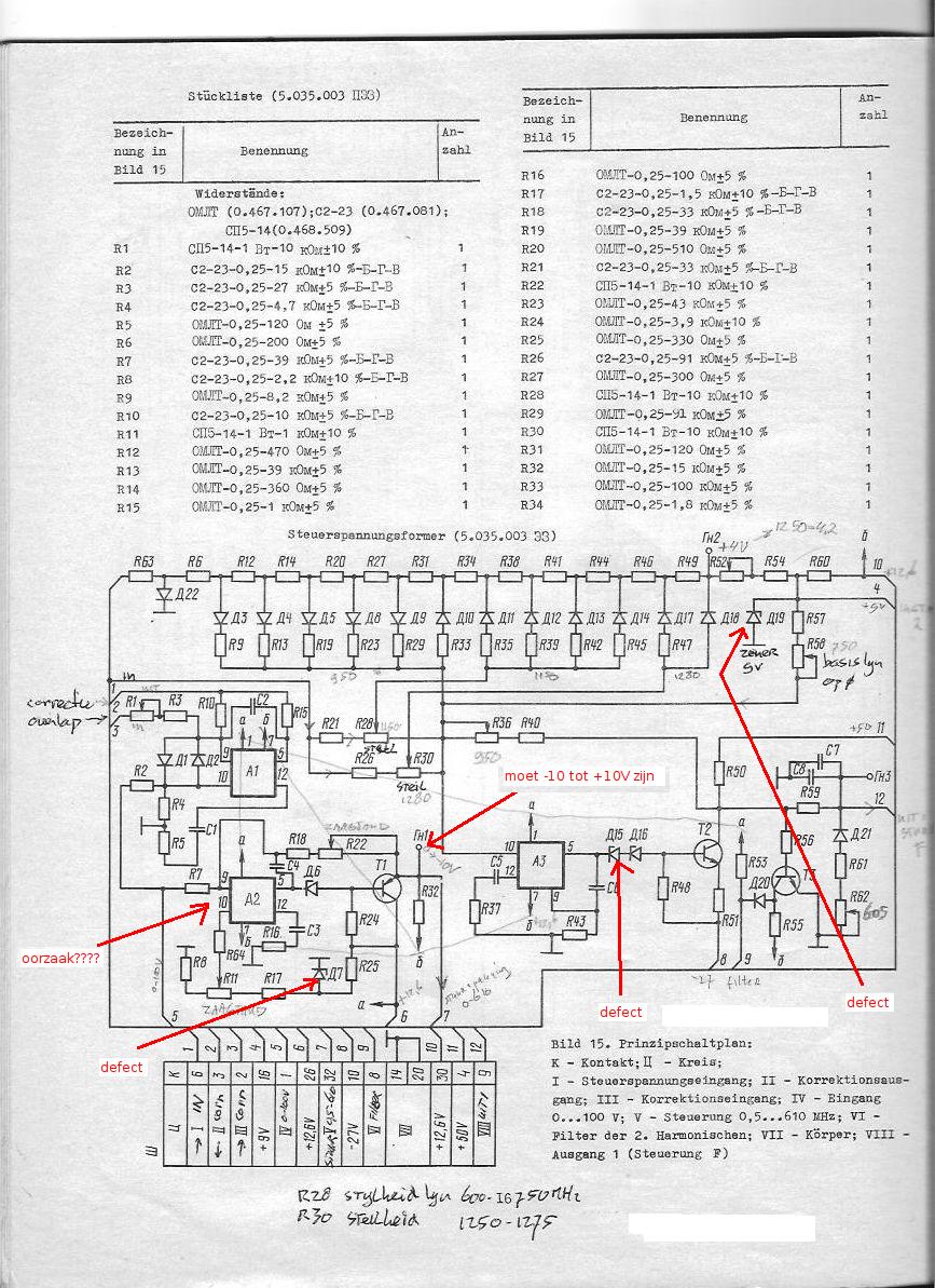 Ik heb de stuurspanningsvormer nagekeken omdat ik daar niet de -10 tot 0 tot +10 krijg op. Daar waren drie zeners kapot. Die heb ik vervangen. Ik meet nu in band 2 op meetpunt rH1wat je met R11 en R22 moet instellen ongeveer +1 tot +9,4V ipv 0 tot +10 en bij omschakelen naar band 1 moet dat -10V tot 0V worden en dan is het vast ongeveer +1V. Die spanning is de stuurspanning voor de VFO. Bij wobbelen loopt als alles goed is hij van 0 tot +10 in band 2 en van -10 tot 0 in band 1.