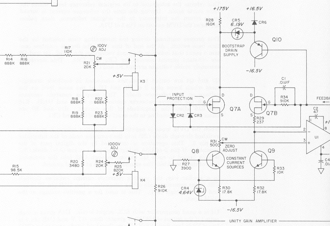 CR4 blijkt te zijn vervangen door een 3V zener ipv een 4,64 forward reference diode. Ik heb hem vervangen door een 55A 5V zener. nu krijg ik in ieder geval de boel daar in evenwicht en alles daar lijkt OK. De -5V komt van Q10 of de gate van Q7 af. Er staat namelijk aan het ander eind bij de ingang van de opamp bijna 0 volt. Q10 blijkt ook niet origineel maar een bc307B te zijn. Deze ga ik los halen en testen. Als die goed is moet het de dubbel FET zijn. ik zal die dan eens vervangen door twee j310's maar die krengen moeten precies gelijk qua pinch off zijn denk ik.